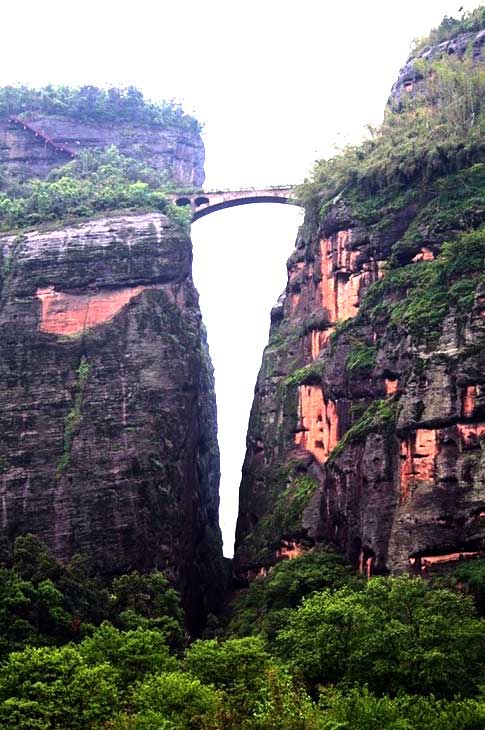 In 1995, a cable car was built to take tourists up to about 1,600 meters high. From 1,600 meters to the peak, a concrete path was built along the rock cliff. Walking on the path is an exciting experience. On one side the cliffs rise straight high above you, while on the other side a deep valley falls down directly below you.