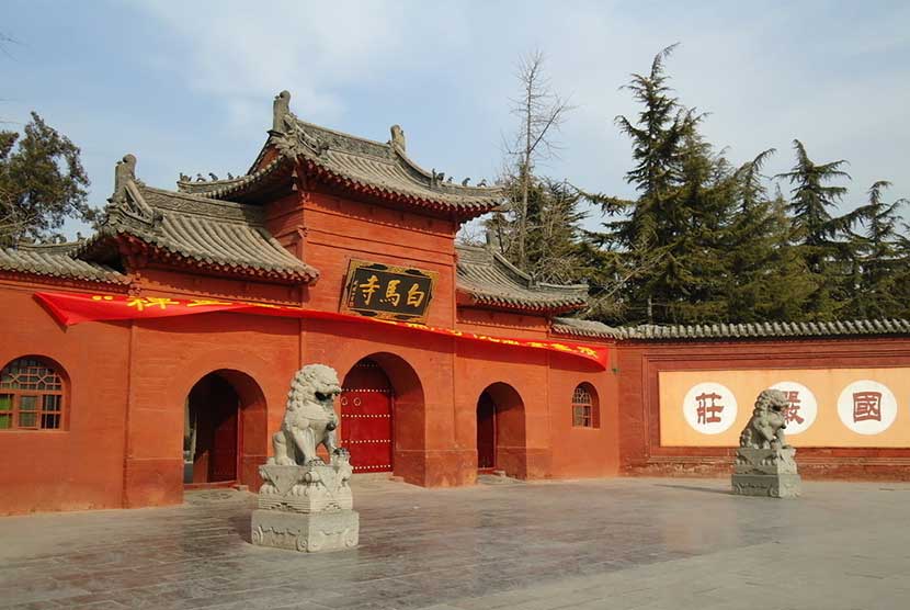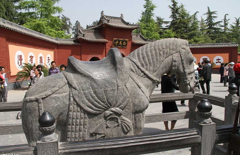 On arrival of the two monks from the land of the Yuezhi (who controlled northern Afghanistan and parts of north-western India at this period), they were housed in the temple. This temple was called the “Pi-ma-sai” meaning White Horse Temple” where ‘pi’ means “white”, ‘ma’ means “horse” and ‘sai’ or ‘ssi’ is “temple”. ‘Ssi’ in Chinese also means residence of “Buddhist priests”.