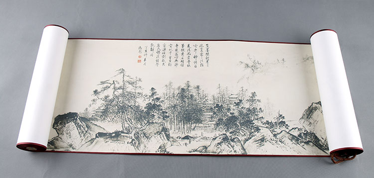 Height: 34 cm, width: 840 cm, painting paper made from rice stalk, silk cloth as background material.