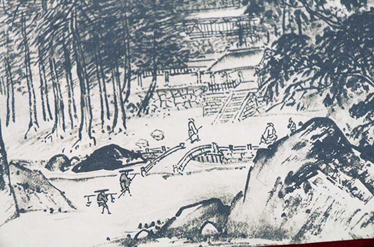 This painting 溪山清远图 features rock hill, steeply rising rock, jungle tree, temple, mountains hazy, vast river surface, landscape running far off. All elements combine very naturally, no sense of procrastination. The rocks was painted like with coarse big ax, with strength in ink rendering. Towers and houses painted in layers, with no artificiality. Although landscape and figures were handled in simplified way, a variety of dynamic interaction appear vividly on the paper.