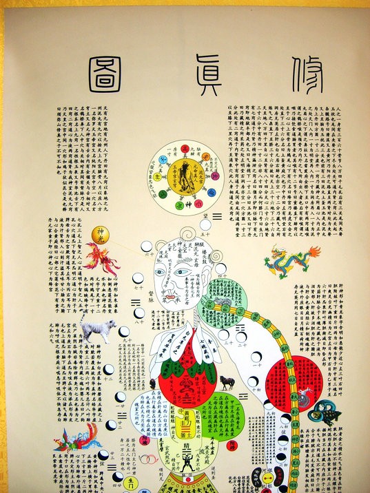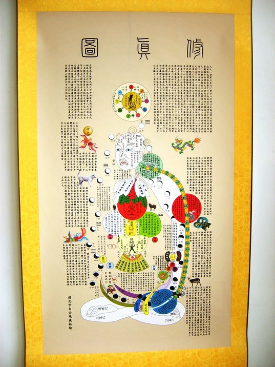 Reality-Cultivating Knacks Chart 修真图 is one illustrating the practical knacks needed for proper practice. Some researchers claim this painting was created based upon the Yellow Court Canon—a very important alchemy practice classics—and it reveals the hidden role for each internal organs and orifices.