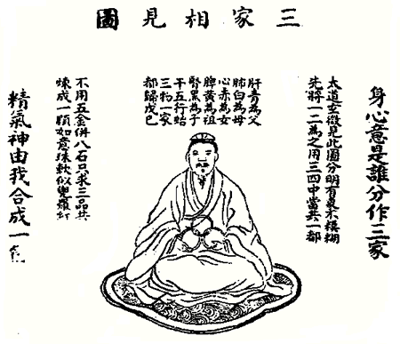 Imperative Doctrines for Innate Nature and Life Force is an ancient book, author unknown. The book illustrates and elaborates the inner refining theory and practice of Taoism, and related topics, The Three Holy Figures at the beginning in the book talks about the theory in terms of Buddhism and Confuciusnism, a clear sign of three religions syncretism. In a whole, it comes down to the Taoist theory. Legend has it that this book derived from the bands by disciples of Yin, who was the disciple of Lao Tzu. Yu Yongning, before Shenzong Emperor of Ming Dynasty (1615), attributed the origin of the book in such way: “There was a man called Wu Siming got the copy Imperative Doctrines for Innate Nature and Life Force from court historian Xin Tang, and it was heard the disciple of Yin wrote this book.’ Included in the book are Taiji Diagram by Confucians Zhou Dunyi, the Buddhist Goddess of Mercy of Secret Mantra, Soaring Figure of Taoism and so on. It is a nice reference for people who want to study the theory and methods on Taoism inner refining in Yuan and Ming Dynasty. Here we include all figures for this book for reference.